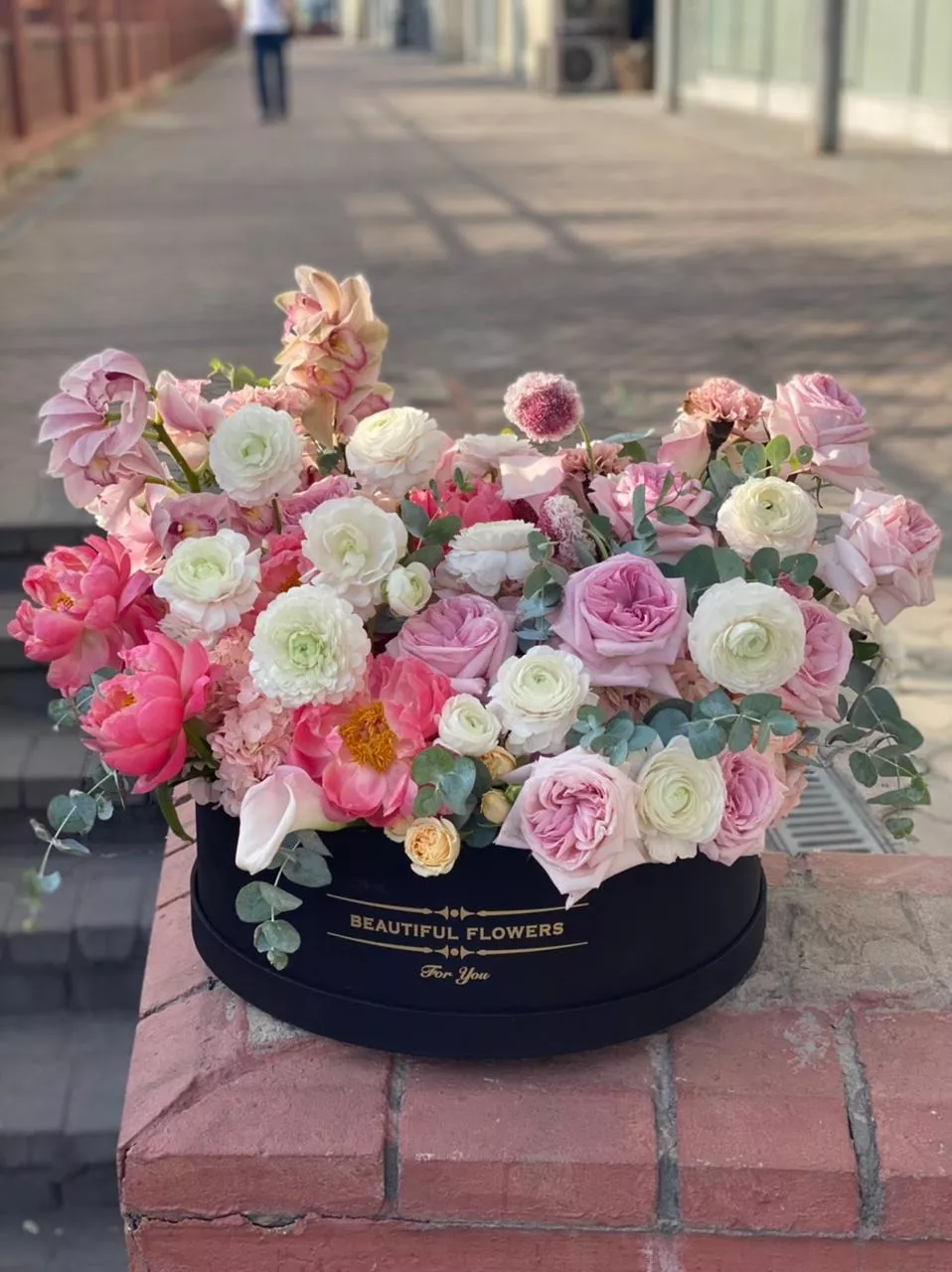 Коробка гигант - 1; Открытка - 1; Гортензия (Колумбия) - 5; Пионовидная роза (Англия) - 18; Гвоздика (Голландия) - 5; Гвоздика крашеная (Голландия) - 7; Ранункулюс (Голландия) - 15; Скабиоза (Голландия) - 7; Роза голландская 60 см - 4; Эвкалипт (Голландия) - 10; Пион (Голландия) - 20; Орхидея цимбидиум (Голландия) - 2; Спрей роза (Кения) - 10; Каллы (Голландия) - 7; Шпажка для открытки - 1;